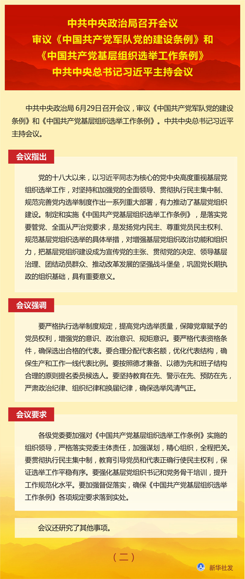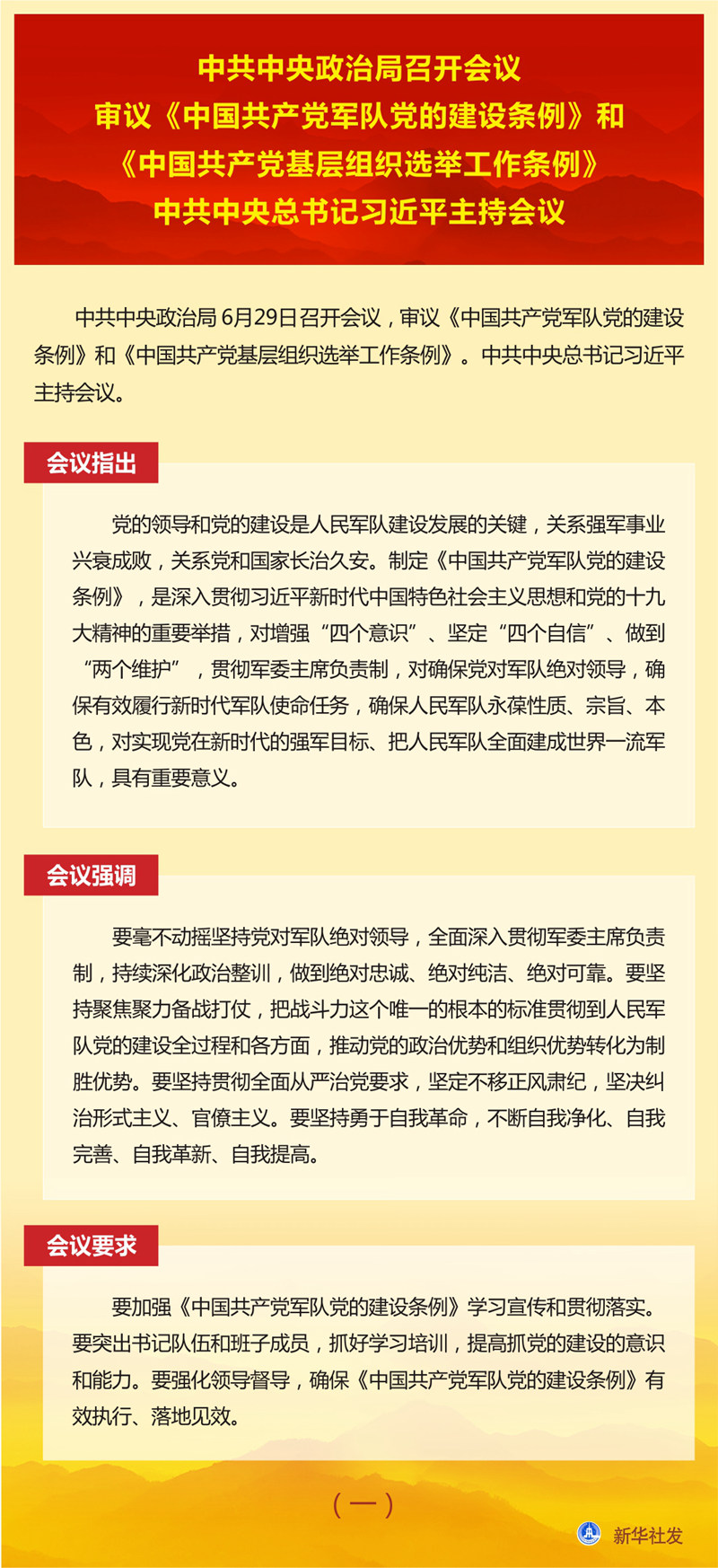 中共中央政治局召開會議 審議《中國共產(chǎn)黨軍隊(duì)黨的建設(shè)條例》和《中國共產(chǎn)黨基層組織選舉工作條例》 中共中央總書記習(xí)近平主持會議 新華社北京6月29日電 中共中央政治局6月29日召開會議,審議《中國共產(chǎn)黨軍隊(duì)黨的建設(shè)條例》和《中國共產(chǎn)黨基層組織選舉工作條例》。中共中央總書記習(xí)近平主持會議。 會議指出,黨的領(lǐng)導(dǎo)和黨的建設(shè)是人民軍隊(duì)建設(shè)發(fā)展的關(guān)鍵,關(guān)系強(qiáng)軍事業(yè)興衰成敗,關(guān)系黨和國家長治久安。制定《中國共產(chǎn)黨軍隊(duì)黨的建設(shè)條例》,是深入貫徹習(xí)近平新時代中國特色社會主義思想和黨的十九大精神的重要舉措,對增強(qiáng)“四個意識”、堅(jiān)定“四個自信”、做到“兩個維護(hù)”,貫徹軍委主席負(fù)責(zé)制,對確保黨對軍隊(duì)絕對領(lǐng)導(dǎo),確保有效履行新時代軍隊(duì)使命任務(wù),確保人民軍隊(duì)永葆性質(zhì)、宗旨、本色,對實(shí)現(xiàn)黨在新時代的強(qiáng)軍目標(biāo)、把人民軍隊(duì)全面建成世界一流軍隊(duì),具有重要意義。 會議強(qiáng)調(diào),要毫不動搖堅(jiān)持黨對軍隊(duì)絕對領(lǐng)導(dǎo),全面深入貫徹軍委主席負(fù)責(zé)制,持續(xù)深化政治整訓(xùn),做到絕對忠誠、絕對純潔、絕對可靠。要堅(jiān)持聚焦聚力備戰(zhàn)打仗,把戰(zhàn)斗力這個唯一的根本的標(biāo)準(zhǔn)貫徹到人民軍隊(duì)黨的建設(shè)全過程和各方面,推動黨的政治優(yōu)勢和組織優(yōu)勢轉(zhuǎn)化為制勝優(yōu)勢。要堅(jiān)持貫徹全面從嚴(yán)治黨要求,堅(jiān)定不移正風(fēng)肅紀(jì),堅(jiān)決糾治形式主義、官僚主義。要堅(jiān)持勇于自我革命,不斷自我凈化、自我完善、自我革新、自我提高。 會議要求,要加強(qiáng)《中國共產(chǎn)黨軍隊(duì)黨的建設(shè)條例》學(xué)習(xí)宣傳和貫徹落實(shí)。要突出書記隊(duì)伍和班子成員,抓好學(xué)習(xí)培訓(xùn),提高抓黨的建設(shè)的意識和能力。要強(qiáng)化領(lǐng)導(dǎo)督導(dǎo),確?!吨袊伯a(chǎn)黨軍隊(duì)黨的建設(shè)條例》有效執(zhí)行、落地見效。 會議指出,黨的十八大以來,以習(xí)近平同志為核心的黨中央高度重視基層黨組織選舉工作,對堅(jiān)持和加強(qiáng)黨的全面領(lǐng)導(dǎo)、貫徹執(zhí)行民主集中制、規(guī)范完善黨內(nèi)選舉制度作出一系列重大部署,有力推動了基層黨組織建設(shè)。制定和實(shí)施《中國共產(chǎn)黨基層組織選舉工作條例》,是落實(shí)黨要管黨、全面從嚴(yán)治黨要求,是發(fā)揚(yáng)黨內(nèi)民主、尊重黨員民主權(quán)利、規(guī)范基層黨組織選舉的具體舉措,對增強(qiáng)基層黨組織政治功能和組織力,把基層黨組織建設(shè)成為宣傳黨的主張、貫徹黨的決定、領(lǐng)導(dǎo)基層治理、團(tuán)結(jié)動員群眾、推動改革發(fā)展的堅(jiān)強(qiáng)戰(zhàn)斗堡壘,鞏固黨長期執(zhí)政的組織基礎(chǔ),具有重要意義。 會議強(qiáng)調(diào),要嚴(yán)格執(zhí)行選舉制度規(guī)定,提高黨內(nèi)選舉質(zhì)量,保障黨章賦予的黨員權(quán)利,增強(qiáng)黨的意識、政治意識、規(guī)矩意識。要嚴(yán)格代表資格條件,確保選出合格的代表。要合理分配代表名額,優(yōu)化代表結(jié)構(gòu),確保生產(chǎn)和工作一線代表比例。要按照德才兼?zhèn)?、以德為先和班子結(jié)構(gòu)合理的原則提名委員候選人。要堅(jiān)持教育在先、警示在先、預(yù)防在先,嚴(yán)肅政治紀(jì)律、組織紀(jì)律和換屆紀(jì)律,確保選舉風(fēng)清氣正。 會議要求,各級黨委要加強(qiáng)對《中國共產(chǎn)黨基層組織選舉工作條例》實(shí)施的組織領(lǐng)導(dǎo),嚴(yán)格落實(shí)黨委主體責(zé)任,加強(qiáng)謀劃,精心組織,全程把關(guān)。要貫徹執(zhí)行民主集中制,教育引導(dǎo)黨員和代表正確行使民主權(quán)利,保證選舉工作平穩(wěn)有序。要強(qiáng)化基層黨組織書記和黨務(wù)骨干培訓(xùn),提升工作規(guī)范化水平。要加強(qiáng)督促落實(shí),確?!吨袊伯a(chǎn)黨基層組織選舉工作條例》各項(xiàng)規(guī)定要求落到實(shí)處。 會議還研究了其他事項(xiàng)。 |
