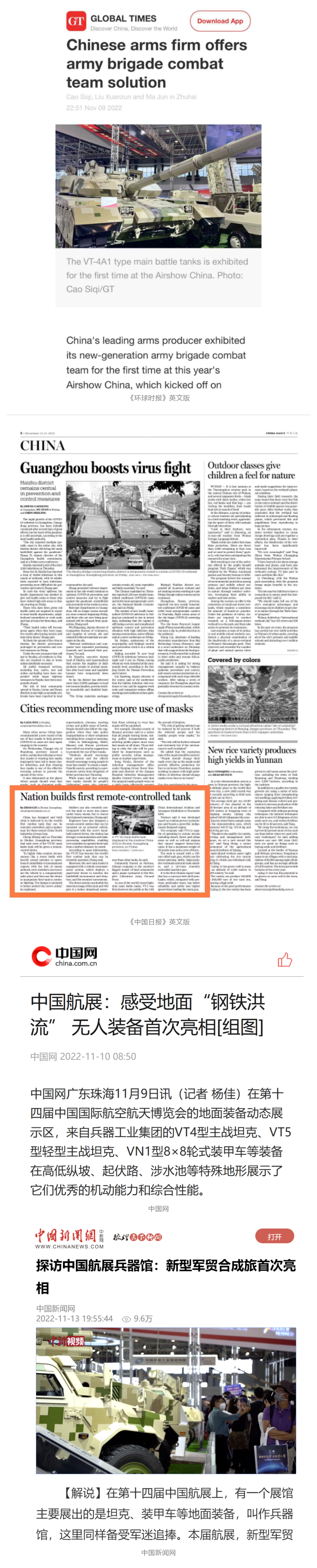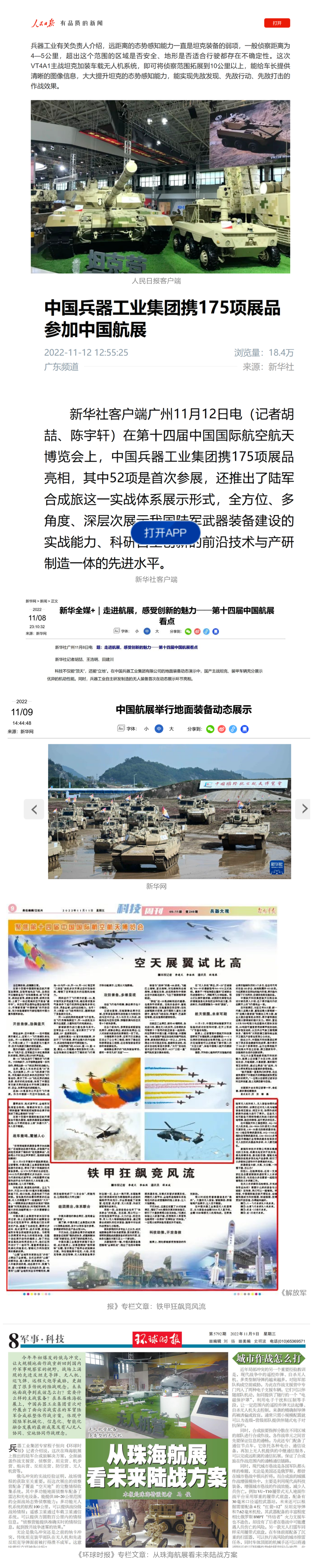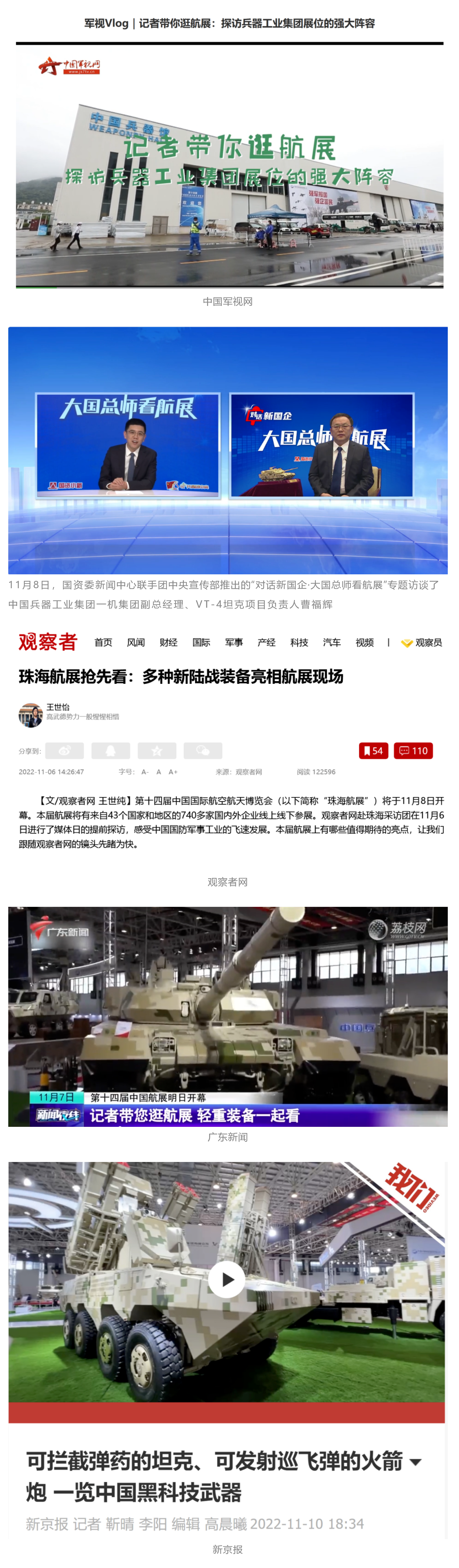 央視國防軍事頻道航展特別報道《炫舞天地間》11月12日《賞“鐵甲雄風(fēng)”!看航展地面裝備“鋼鐵洪流”名場面》對兵器工業(yè)集團(tuán)武器裝備特色亮點進(jìn)行報道。《國防軍事早報》11月7日推出報道《第十四屆中國國際航空航天博覽會明天開幕 中國兵器館首次以陸軍合成旅實戰(zhàn)體系形式展出》,對兵器館陸軍合成旅實戰(zhàn)體系進(jìn)行報道?!盾娛聢蟮馈?1月9日推出《第十四屆中國國際航空航天博覽會 地面兵器裝備首次聯(lián)合陸航直升機進(jìn)行動態(tài)展示》報道?!盾娒孕刑煜隆?1月9日推出報道《軍迷打卡航展2022》以專業(yè)軍迷視角探館兵器館,全面展示兵器工業(yè)集團(tuán)參展裝備特色亮點。