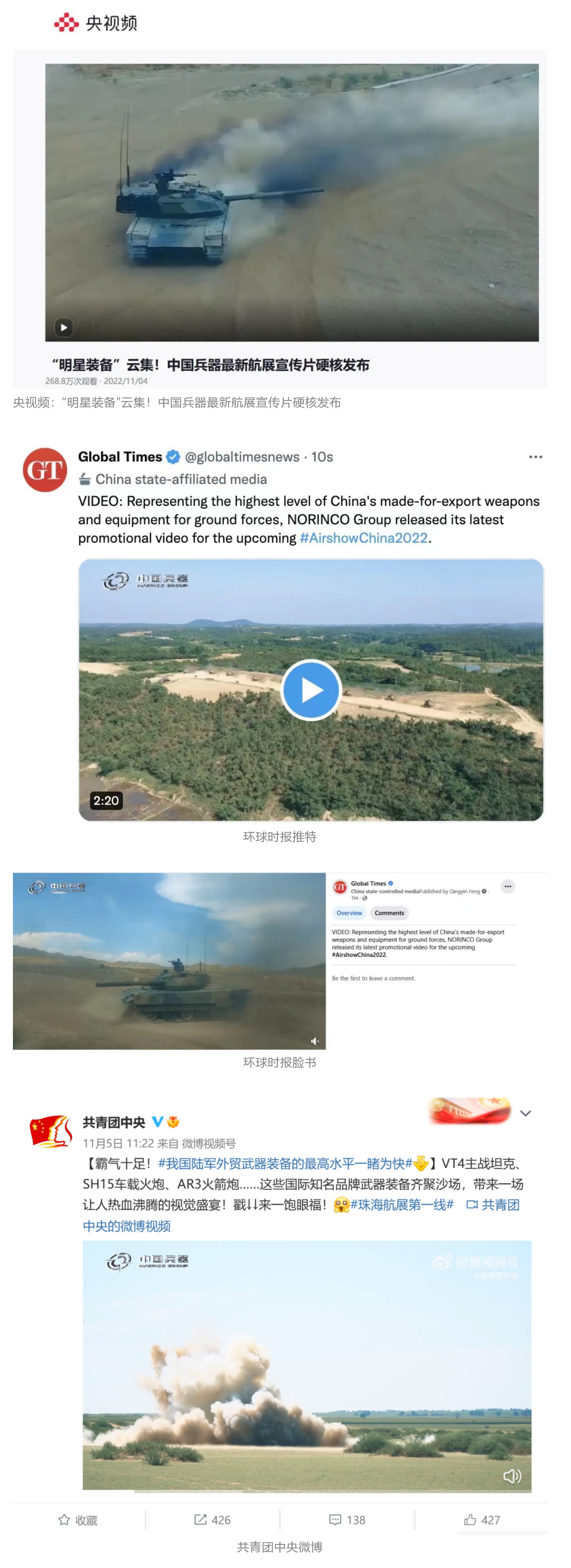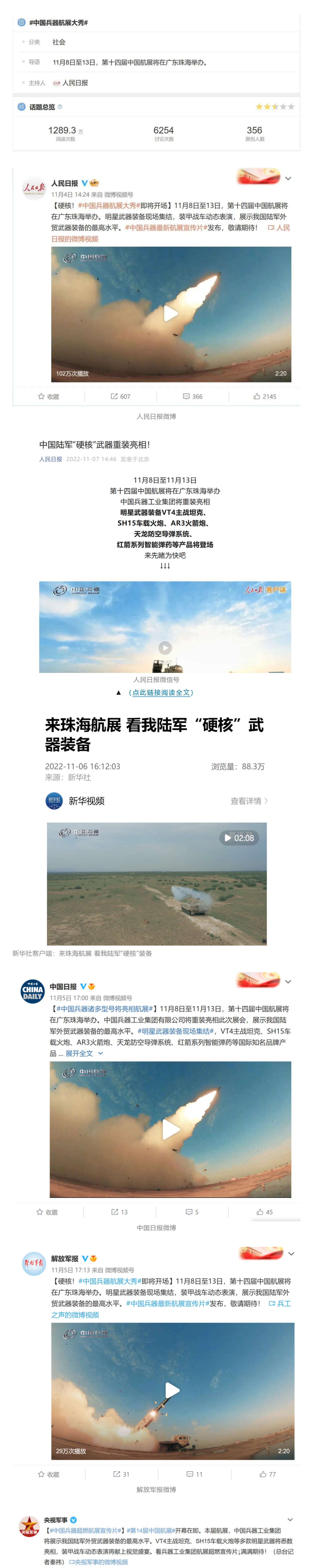 人民日報官方微博、微信公眾號,新華社客戶端、央視新聞客戶端、中國日報微博、參考消息微信公眾號、解放軍報微博、央視軍事微博、CGTN微博、中國軍號微博、共青團(tuán)中央微博、環(huán)球時報(英文網(wǎng)站、臉書賬號、推特賬號)、嗶哩嗶哩、學(xué)習(xí)強國平臺、國資小新視頻號、網(wǎng)易軍事、騰訊軍事、鳳凰軍事、北京日報、東方衛(wèi)視看看新聞全媒體、北京電視臺等20余家中央主流媒體、國家部委、省市媒體的新媒體第一時間播發(fā)集團(tuán)公司航展宣傳片等視頻作品燃爆全網(wǎng),累計閱讀量突破1700萬人次。集團(tuán)公司微信公眾號、微博、抖音號、快手號、微信視頻號、知乎號等新媒體宣傳片播放閱讀量超過800萬人次,點贊超過30萬人次。集團(tuán)公司微信公眾號推出《硬核!中國兵器最新航展宣傳片發(fā)布》《中國兵器航展節(jié)目單,請選出心中明星裝備》《航展首日,中國兵器閃耀亮相!》等7篇報道,閱讀量超過25萬人次,集團(tuán)公司微信視頻號、抖音號、快手號等新媒體賬號發(fā)布“中國兵器航展大秀”系列視頻,觀看量超過330萬人次。