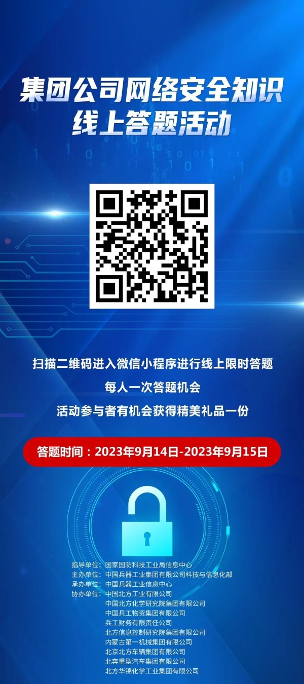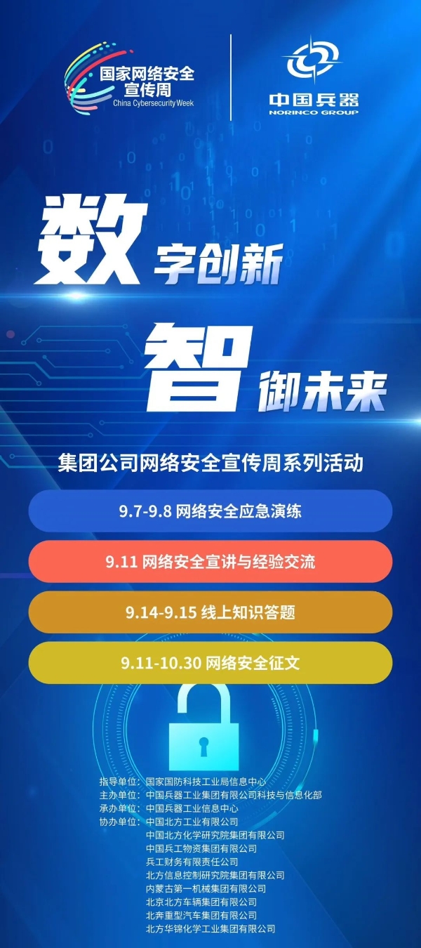9月11日至17日,中國(guó)兵器工業(yè)集團(tuán)有限公司以“數(shù)字創(chuàng)新 智御未來(lái)”為主題,圍繞集團(tuán)公司“1+5”戰(zhàn)略和“雙十”規(guī)劃,組織開(kāi)展集團(tuán)公司網(wǎng)絡(luò)安全宣傳周系列活動(dòng)。 9月11日,集團(tuán)公司科技與信息化部組織在京單位召開(kāi)網(wǎng)絡(luò)安全宣講與經(jīng)驗(yàn)交流活動(dòng),邀請(qǐng)公安部第一研究所網(wǎng)絡(luò)安全專(zhuān)家針對(duì)網(wǎng)絡(luò)安全形勢(shì)和個(gè)人防護(hù)技能以及網(wǎng)絡(luò)安全等級(jí)保護(hù)主要工作環(huán)節(jié)和標(biāo)準(zhǔn)應(yīng)用作專(zhuān)題講座,會(huì)上北方公司、物資集團(tuán)、財(cái)務(wù)公司、北方車(chē)輛集團(tuán)、北奔重汽進(jìn)行了工作經(jīng)驗(yàn)分享。