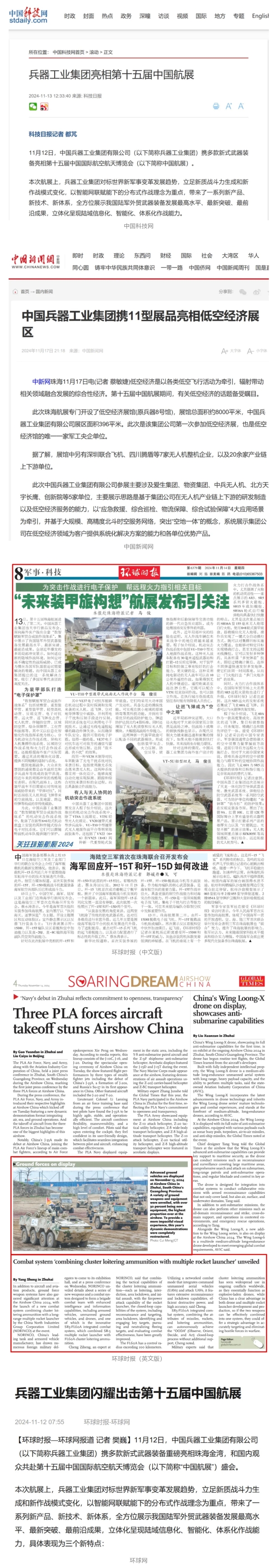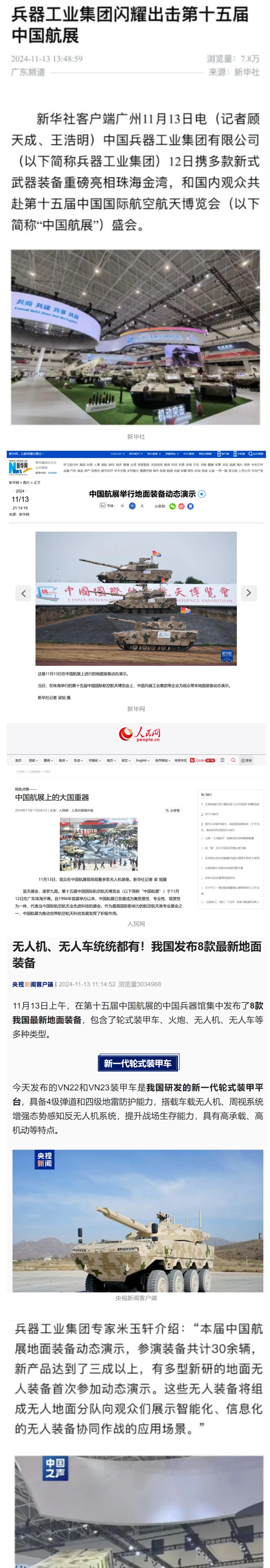 11月12日至17日,第十五屆中國國際航空航天博覽會在廣東省珠海市舉行,中國兵器工業(yè)集團有限公司突出數(shù)智賦能軍貿(mào)合成旅作戰(zhàn)體系,帶來了一系列新產(chǎn)品、新技術(shù)、新體系,全方位展示我國陸軍外貿(mào)武器裝備發(fā)展最高水平、最新突破、最前沿成果,立體化呈現(xiàn)陸域信息化、智能化、體系化作戰(zhàn)能力,受到了全社會廣泛關(guān)注。航展期間,央視綜合頻道《新聞聯(lián)播》、央視新聞頻道《新聞直播間》《長空鵬程》報道兵器工業(yè)集團參展情況,重點介紹了VT4A1主戰(zhàn)坦克、輪式裝甲火炮、新一代陸域指控信息系統(tǒng)、無人戰(zhàn)車、民用無人運輸機及地面裝備演示有關(guān)內(nèi)容。央視新聞推出航展直播節(jié)目《藍天之約》,邀請兵器工業(yè)集團嘉賓對參展情況、裝備動態(tài)演示作了講解。