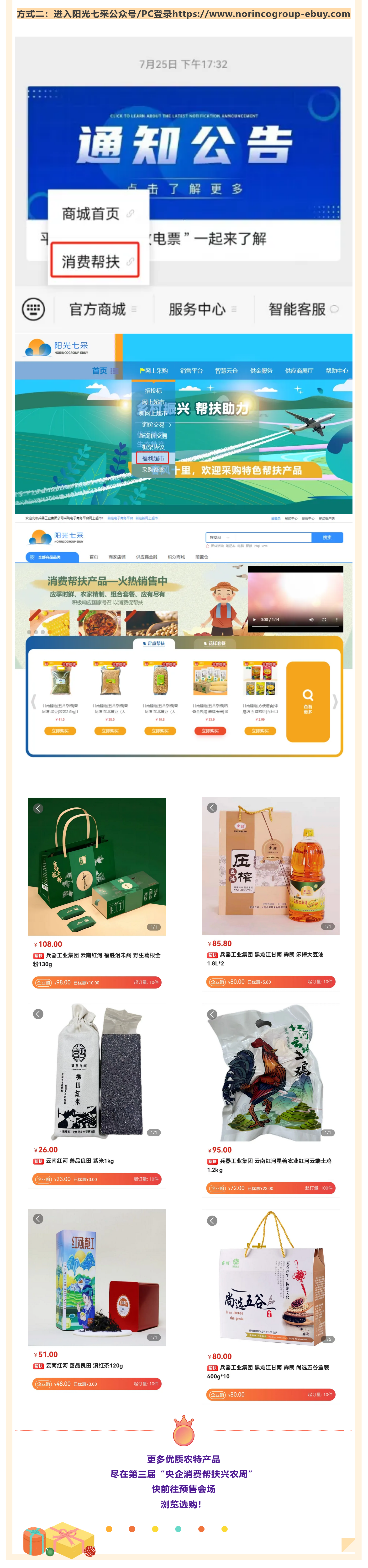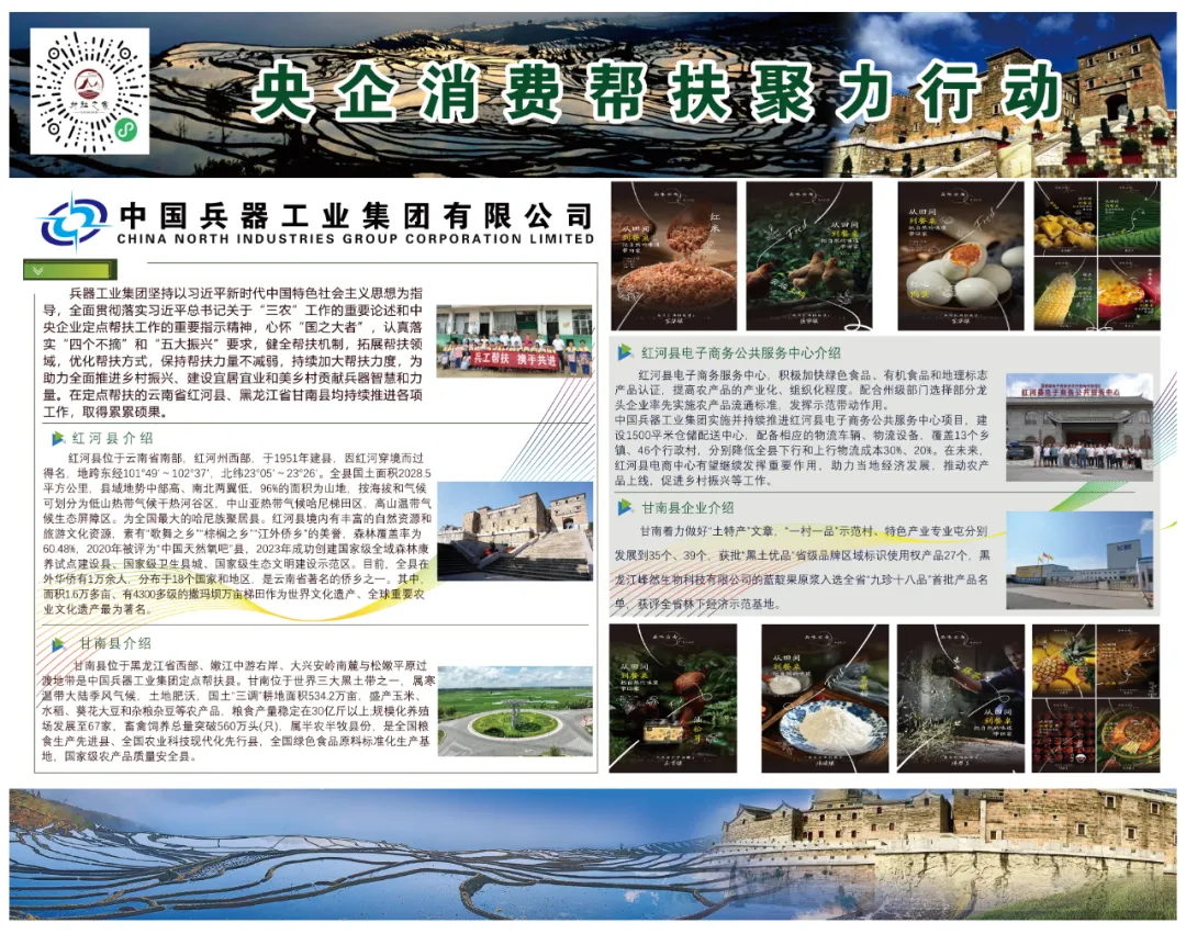 百家央企聚合力 消費幫扶促振興 第三屆“央企消費幫扶興農(nóng)周” 預售已啟動 8月30日 興農(nóng)周活動將正式開啟 “央企消費幫扶興農(nóng)周”由國務院國資委社會責任局指導,央企消費幫扶電商平臺(國網(wǎng)數(shù)字科技控股有限公司)主辦,國務院國資委機關(guān)服務管理局、國務院國資委新聞中心、國網(wǎng)北京市電力公司、各中央企業(yè)電商平臺聯(lián)合協(xié)辦。 活動以“央企攜手,興農(nóng)惠民”為主題,組織動員中央企業(yè)所屬各單位各部門(特別是工會、食堂)、廣大干部職工、上下游供應商和業(yè)務合作伙伴采購幫扶縣的優(yōu)質(zhì)農(nóng)產(chǎn)品,促進脫貧地區(qū)產(chǎn)業(yè)發(fā)展和脫貧群眾穩(wěn)定增收,鞏固拓展脫貧攻堅成果。 預售活動火熱開啟 為方便大家提前選購 此次預售期升級為10天 (8月20日-8月29日) 誠邀下單 兵器工業(yè)集團定點幫扶 黑龍江甘南縣、云南紅河縣 農(nóng)特產(chǎn)品! 8月30日-9月5日 請鎖定“央企館-兵器工業(yè)集團” 我們一起共譜鄉(xiāng)村振興新篇章! |