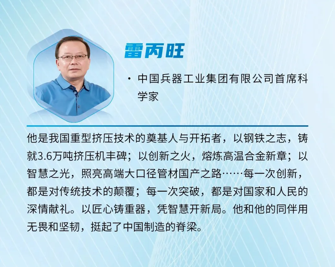 近日,《科學(xué)中國(guó)人》雜志社發(fā)布2024“年度科技人物”榜單,中國(guó)兵器首席科學(xué)家、北重集團(tuán)雷丙旺當(dāng)選“影響力科學(xué)家”。 雷丙旺是我國(guó)極端金屬擠壓技術(shù)的開(kāi)拓者,扎根邊疆地區(qū)國(guó)防特大型企業(yè)工作38年,長(zhǎng)期從事金屬成形制造裝備與工藝研究工作。他研制出我國(guó)極限制造的大國(guó)重器——3.6萬(wàn)噸黑色金屬垂直擠壓機(jī),一舉打破國(guó)外技術(shù)封鎖,填補(bǔ)國(guó)內(nèi)空白,實(shí)現(xiàn)了超(超)臨界電站核心管道和航空發(fā)動(dòng)機(jī)高壓渦輪盤(pán)粉末合金棒材的中國(guó)制造,開(kāi)發(fā)出成套關(guān)鍵技術(shù),取得一系列原創(chuàng)性成果,促進(jìn)了產(chǎn)業(yè)的融合發(fā)展,創(chuàng)造巨大經(jīng)濟(jì)社會(huì)效益。