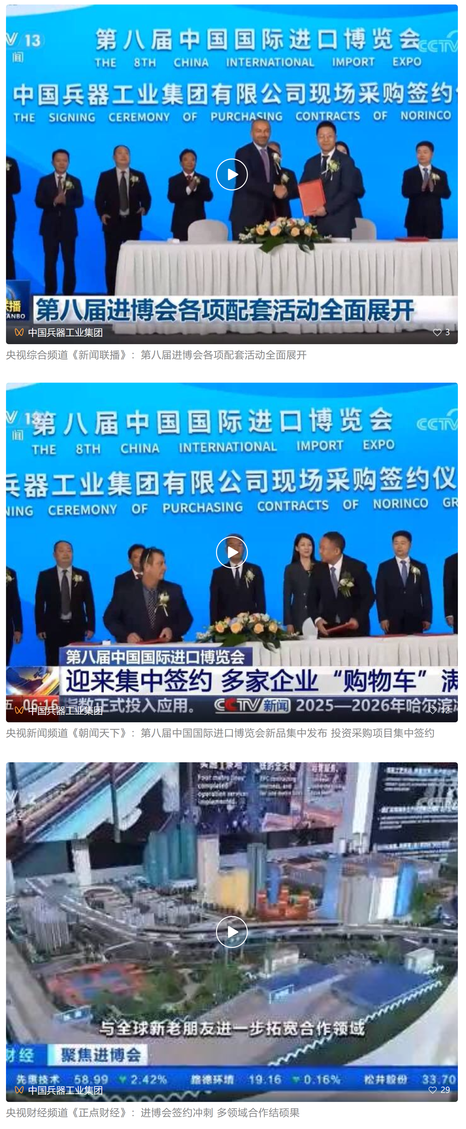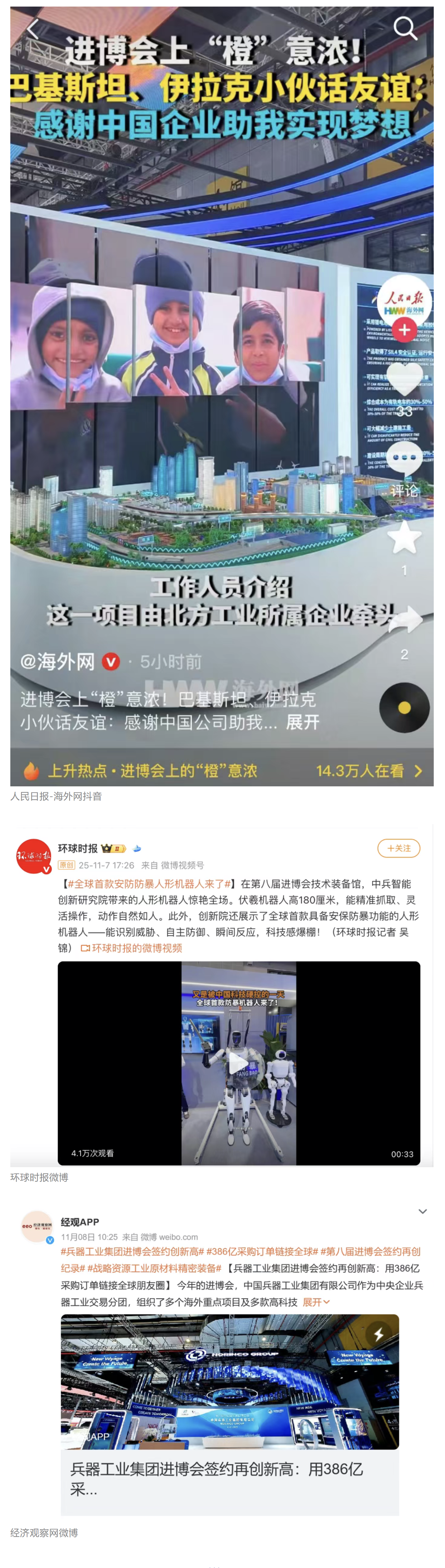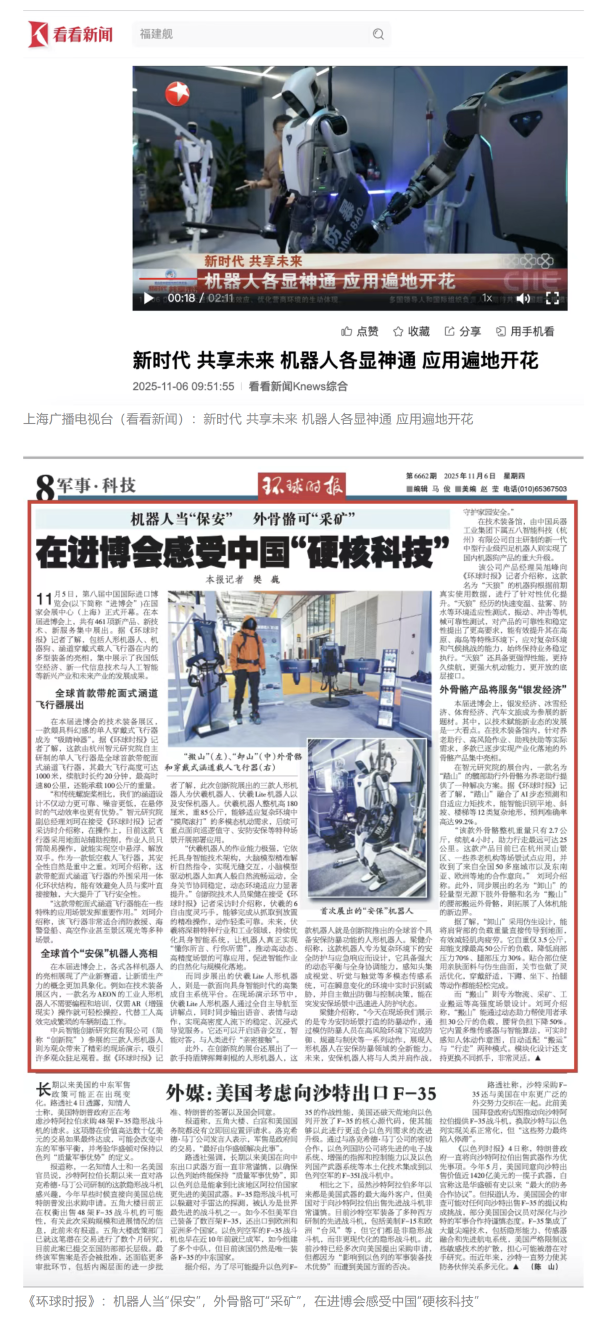 11月5日至10日,中國兵器工業(yè)集團有限公司組團參加第八屆中國國際進口博覽會。集團公司以“堅持合作共贏,推進高水平對外開放,助力構(gòu)建新發(fā)展格局”為目標,圍繞“新征程,共創(chuàng)未來”主題組團參展,集中展示了一系列新技術(shù)、新理念、新成果,取得豐碩成果,受到廣泛關(guān)注。 嘉賓云集 本屆進博會上,蒙古國駐華大使、贊比亞礦業(yè)和礦產(chǎn)開發(fā)部常任秘書、津巴布韋首席司長等多國政要蒞臨集團公司組展展區(qū),了解有關(guān)項目情況。 國家能源集團、東風汽車、哈電集團、鞍鋼集團、中鋁集團、通用技術(shù)集團、中國中車、中國長安汽車、中國電建等央企領(lǐng)導,工信部、國務院國資委、中國貿(mào)促會、陜西省、上海市、浙江省等國內(nèi)政府部門領(lǐng)導以及國內(nèi)外合作伙伴蒞臨集團公司組展展區(qū)參觀指導。對集團公司高質(zhì)量共建“一帶一路”,與各國合作伙伴共享發(fā)展機遇、實現(xiàn)互利共贏給予高度評價。 媒體關(guān)注 集團公司集中簽約亮相央視綜合頻道《新聞聯(lián)播》、央視新聞頻道《朝聞天下》《新聞30分》《共同關(guān)注》、央視財經(jīng)頻道《正點財經(jīng)》《經(jīng)濟信息聯(lián)播》。 《環(huán)球時報》、環(huán)球網(wǎng)、《新京報》、《中國旅游報》等對集團公司人形機器人、四足機器人、涵道穿戴式載人飛行器、外骨骼等多型新域新質(zhì)產(chǎn)品,集中亮相進行報道。新華社、央廣中國之聲、新京報(貝殼財經(jīng))、上海廣播電視臺等媒體直播探館,打卡兵器“硬核科技”。 人民日報客戶端、新華社客戶端、人民網(wǎng)、中國網(wǎng)、中國日報網(wǎng)、國務院國資委網(wǎng)站、國資小新微信公眾號、國資小新Facebook、學習強國中央企業(yè)學習平臺、經(jīng)濟觀察網(wǎng)、新京報客戶端等第一時間刊發(fā)集團公司組展簽約、ESG建設(shè)等情況。新浪財經(jīng)、界面新聞等商業(yè)平臺閱讀量累計超500萬次。 在微博、抖音等新媒體平臺上,集團公司高科技產(chǎn)品演示、5D穹幕電影體驗等短視頻持續(xù)引爆流量,累計播放量超800萬次,點贊量破50萬。“兵器工業(yè)集團進博會簽約386億”相關(guān)話題登上微博熱搜榜,閱讀量破5000萬次。 文字丨劉暢 |