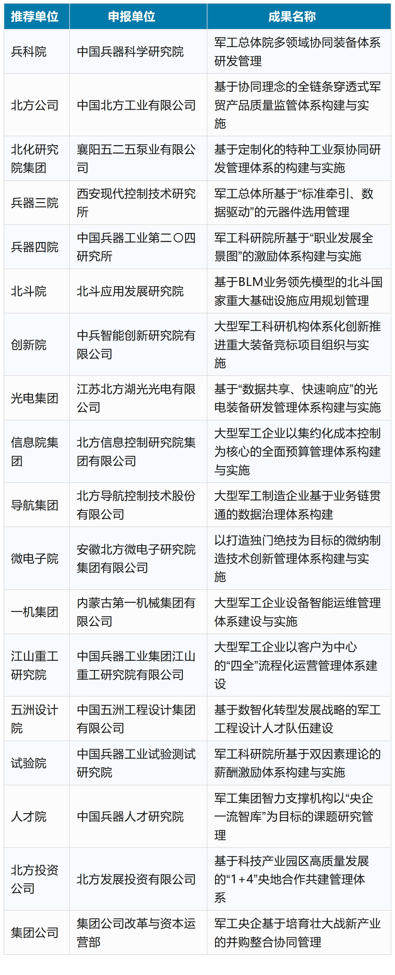 為促進(jìn)管理創(chuàng)新和改革發(fā)展,引導(dǎo)各單位在管理實(shí)踐中運(yùn)用現(xiàn)代管理科學(xué)理論和方法,創(chuàng)新經(jīng)營(yíng)理念,革新管理制度,改進(jìn)管理方式、管理組織、管理方法,營(yíng)造鼓勵(lì)創(chuàng)新、尊重知識(shí)、尊重實(shí)踐、尊重人才的創(chuàng)新環(huán)境。中國(guó)兵器工業(yè)集團(tuán)有限公司組織開(kāi)展了2025年度管理創(chuàng)新成果的申報(bào)、推薦與審定工作。經(jīng)初審、初評(píng)、答辯及終審、公示等環(huán)節(jié),最終評(píng)出獲獎(jiǎng)成果91項(xiàng),其中:一等獎(jiǎng)18項(xiàng)、二等獎(jiǎng)24項(xiàng)、三等獎(jiǎng)49項(xiàng)。 兵器工業(yè)集團(tuán)2025年度一等獲獎(jiǎng)成果名單