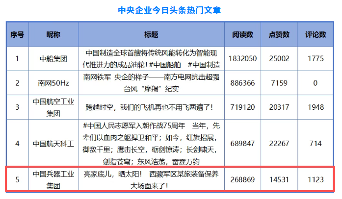 《亮家底兒,曬太陽!西藏軍區(qū)某裝備保養(yǎng)大場面來了!》入選中央企業(yè)今日頭條熱門文章。